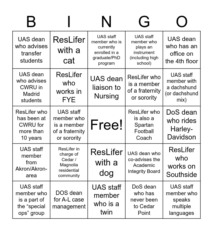 This bingo card has a free space and 24 words: ResLifer in charge of Cedar / Magnolia residential community, DOS dean for A-L case management, UAS dean liaison to Nursing, UAS staff member who is a part of the “special ops” group, UAS dean who has an office on the 4th floor, UAS dean who advises transfer students, UAS dean who advises CWRU in Madrid students, ResLifer with a cat, ResLifer who is also a Spartan Football Coach, ResLifer with a dog, ResLifer who is a member of a fraternity or sorority, ResLifer who has been at CWRU for more than 10 years, UAS dean who co-advises the Academic Integrity Board, ResLifer who works on Southside, ResLifer who works in FYE, DoS dean who has never been to Cedar Point, DoS dean who rides Harley-Davidson, UAS staff member who is currently enrolled in a graduate/PhD program, UAS staff member with a dachshund (or dachshund mix), UAS staff member who is a member of a fraternity or sorority, UAS staff member who speaks multiple languages, UAS staff member from Akron/Akron-area, UAS staff member who plays an instrument (including high school) and UAS staff member who is a twin.