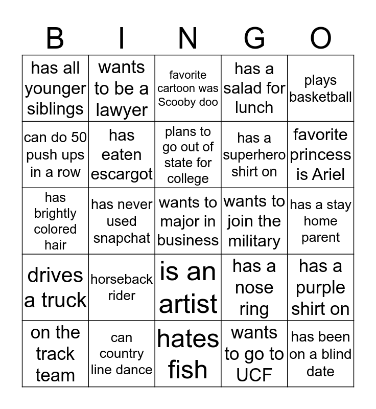 This bingo card has a free space and 24 words: horseback rider, can country line dance, plans to go out of state for college, on the track team, plays basketball, has all younger siblings, can do 50 push ups in a row, wants to be a lawyer, wants to join the military, is an artist, has a superhero shirt on, has brightly colored hair, has a nose ring, has a purple shirt on, has eaten escargot, wants to go to UCF, has a stay home parent, favorite cartoon was Scooby doo, favorite princess is Ariel, has never used snapchat, has been on a blind date, drives a truck, has a salad for lunch and hates fish.