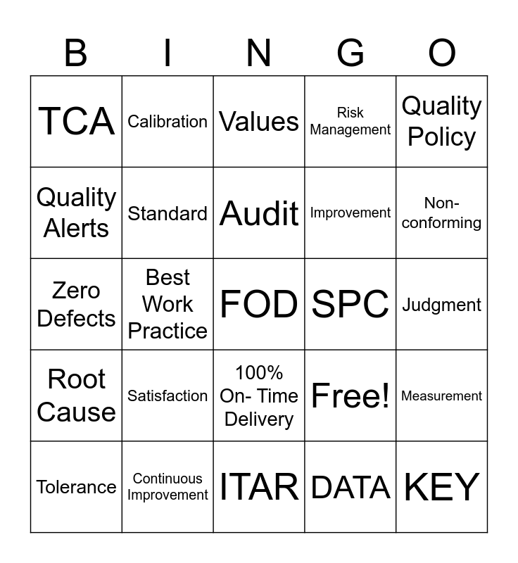 This bingo card has 25 words: Satisfaction, ITAR, Audit, Tolerance, Quality Policy, TCA, Quality Alerts, Calibration, SPC, 100% On- Time Delivery, Improvement, Zero Defects, Free!, Measurement, Standard, KEY, Judgment, Values, Non-conforming, Best Work Practice, FOD, Continuous Improvement, Root Cause, Risk Management and DATA.