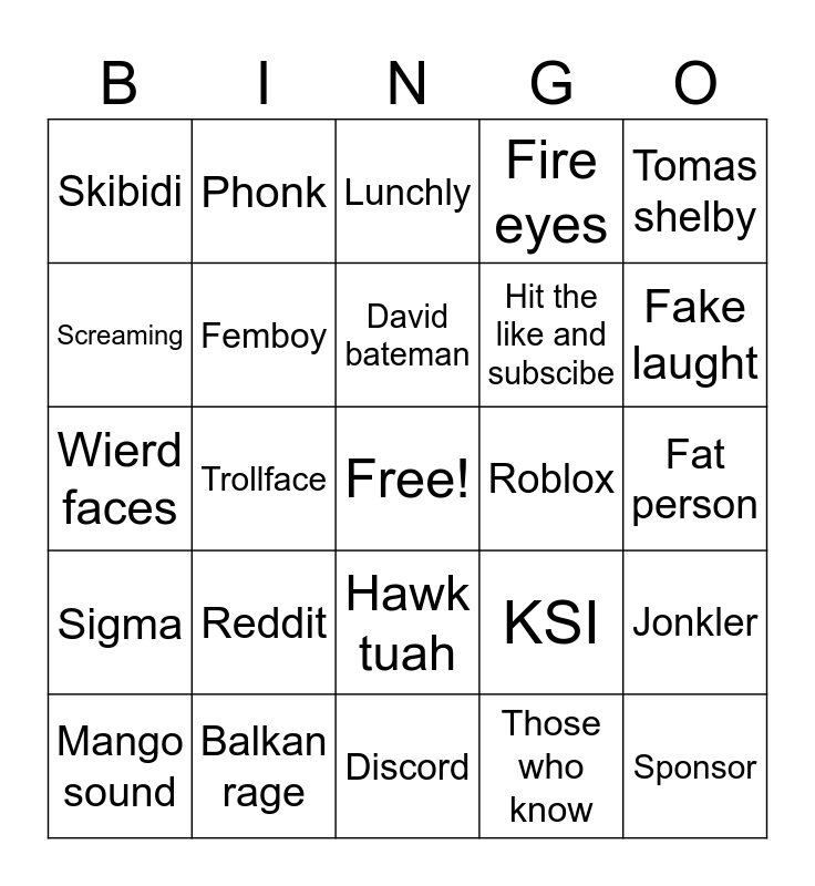 This bingo card has a free space and 29 words: Mango sound, Mrbeast, Trollface, Anime, Skibidi, Lunchly, Femboy, Reddit, Roblox, Balkan rage, Fat person, Sponsor, Discord, Those who know, Fake laught, Cosco guys, Hawk tuah, Sigma, Tomas shelby, Wierd faces, KSI, Hit bell icon, Hit the like and subscibe, Screaming, Fire eyes, Phonk, Jonkler, David bateman and Brainrot.