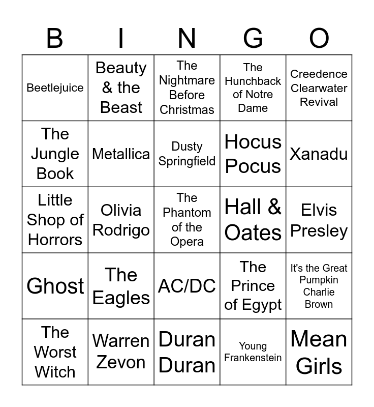 This bingo card has 75 words: Ghostbusters, Bobby Pickett, The Nightmare Before Christmas, Carrie, The Rocky Horror Picture Show, Pinocchio, Rodgers & Hart, Rihanna, Tangled, Aladdin, Mean Girls, Shakira, Dusty Springfield, The Jungle Book, Alice in Wonderland, Olivia Rodrigo, Lestat, The Phantom of the Opera, The Great Mouse Detective, Creedence Clearwater Revival, The Lion King, Little Shop of Horrors, Metallica, Beauty & the Beast, The Hunchback of Notre Dame, American Psycho, Sweeney Todd, The Rolling Stones, How The Grinch Stole Christmas, Jekyll & Hyde, Anastasia, The Talking Heads, Muppet Christmas Carol, The Prince of Egypt, Xanadu, Hocus Pocus, Hocus Pocus 2, Lady Gaga, Elvis Presley, Young Frankenstein, Winnie the Pooh, Shrek 2, Finian's Rainbow, The Little Mermaid, Sheb Wooley, Frankenweenie Sinatra, The Worst Witch, Beetlejuice, Frozen, 101 Dalmations, Heathers, AC/DC, Into The Woods, Annie, The Searchers, The Sword & the Stone, Robin Hood, The Addams Family, Michael Jackson, Britney Spears, The Eagles, Peter Pan, Ichabod & Mr.Toad, Meat Loaf, The Princess & the Frog, Hall & Oates, Halloween, Rockwell, Stevie Wonder, It's the Great Pumpkin Charlie Brown, Ghost, Warren Zevon, Pochahontas, Duran Duran and The Munsters.