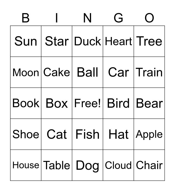 This bingo card has a free space and 25 words: Cat, Dog, Ball, House, Tree, Sun, Moon, Star, Bird, Fish, Car, Book, Hat, Apple, Cake, Flower, Bear, Duck, Train, Box, Chair, Table, Shoe, Heart and Cloud.