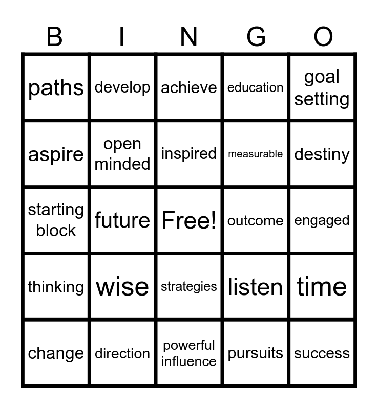 This bingo card has a free space and 24 words: change, wise, inspired, pursuits, goal setting, paths, develop, achieve, outcome, engaged, starting block, open minded, listen, time, aspire, direction, powerful influence, education, destiny, thinking, future, strategies, measurable and success.