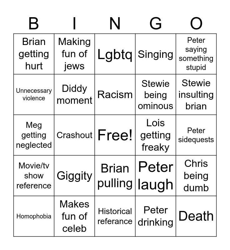 This bingo card has a free space and 24 words: Giggity, Makes fun of celeb, Racism, Homophobia, Peter saying something stupid, Brian getting hurt, Unnecessary violence, Making fun of jews, Lois getting freaky, Brian pulling, Stewie being ominous, Meg getting neglected, Peter laugh, Chris being dumb, Diddy moment, Peter drinking, Peter sidequests, Lgbtq, Stewie insulting brian, Crashout, Death, Movie/tv show reference, Singing and Historical referance.