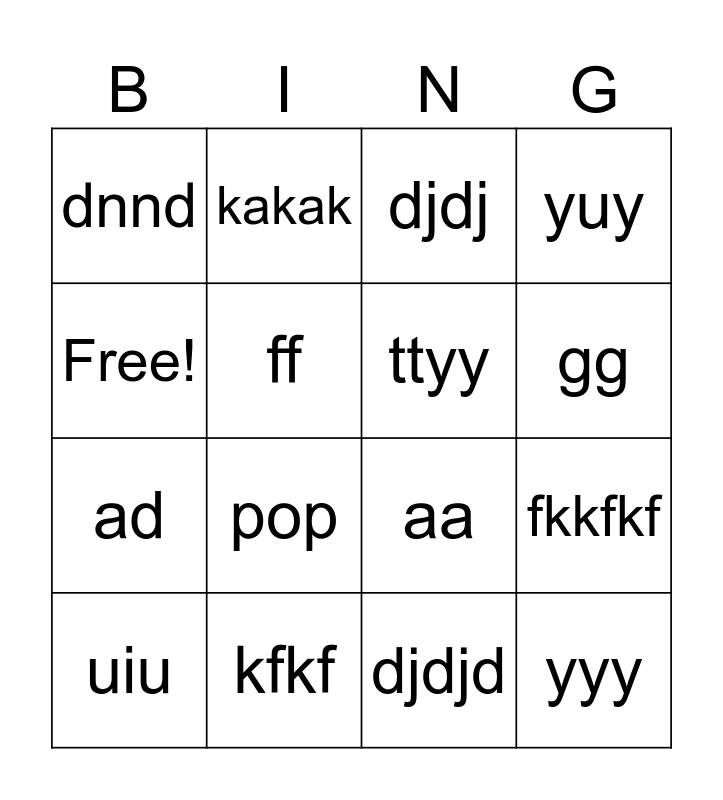This bingo card has 16 words: kfkf, fkkfkf, djdj, dnnd, ad, kakak, aa, djdjd, Free!, ff, uiu, yuy, pop, gg, ttyy and yyy.