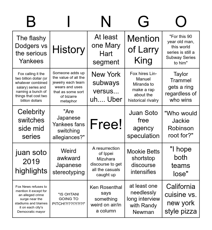 This bingo card has a free space and 24 words: Weird awkward Japanese stereotyping, "IS OHTANI GOING TO PITCH!?!??!?!?!?!", New York subways versus... uh.... Uber, Fox News refuses to mention it except for an alleged crime surge near the stadiums and blames it on each city's Democratic mayor, "For this 90 year old man, this world series is still a Subway Series to him", The flashy Dodgers vs the serious Yankees, Fox calling it the two billion dollar (or whatever combined salary) series and naming a bunch of things that cost two billion dollars, History, Juan Soto free agency speculation, A resurrection of Ippei Mizuhara discourse to get all the casuals caught up, Fox hires Lin-Manuel Miranda to make a rap about the historical rivalry, Celebrity switches side mid series, Mookie Betts shortstop discourse intensifies, "I hope both teams lose", Someone adds up the value of all the jewelry each team wears and uses that as some sort of bizarre metaphor, at least one needlessly long interview with Randy Newman, "Who would Jackie Robinson root for?", At least one Mary Hart segment, Taylor Trammel gets a ring regardless of who wins, "Are Japanese Yankees fans switching allegiances?", California cuisine vs. new york style pizza, juan soto 2019 highlights, Mention of Larry King and Ken Rosenthal says something weird on air/in a column.