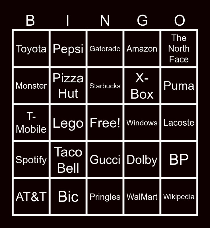 This bingo card has a free space and 49 words: Shell, Wikipedia, Target, Pringles, Taco Bell, Adidas, Pepsi, Atari, Monster, PlayStation, Pizza Hut, Amazon, BP, Dolby, Firestone, KFC, Starbucks, Windows, Google, The North Face, Lego, WalMart, Toyota, X-Box, Burger King, Puma, AT&T, Firefox, Gucci, Spotify, Beats, SnapChat, McDonald’s, Instagram, Bic, Wendy’s, Motorola, Kodak, Lacoste, Gmail, LG, Chanel, Converse, Mastercard, T-Mobile, Gatorade, Tide, Bacardi and Nike.