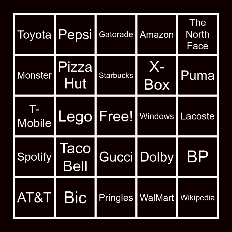 This bingo card has a free space and 49 words: Shell, Wikipedia, Target, Pringles, Taco Bell, Adidas, Pepsi, Atari, Monster, PlayStation, Pizza Hut, Amazon, BP, Dolby, Firestone, KFC, Starbucks, Windows, Google, The North Face, Lego, WalMart, Toyota, X-Box, Burger King, Puma, AT&T, Firefox, Gucci, Spotify, Beats, SnapChat, McDonald’s, Instagram, Bic, Wendy’s, Motorola, Kodak, Lacoste, Gmail, LG, Chanel, Converse, Mastercard, T-Mobile, Gatorade, Tide, Bacardi and Nike.