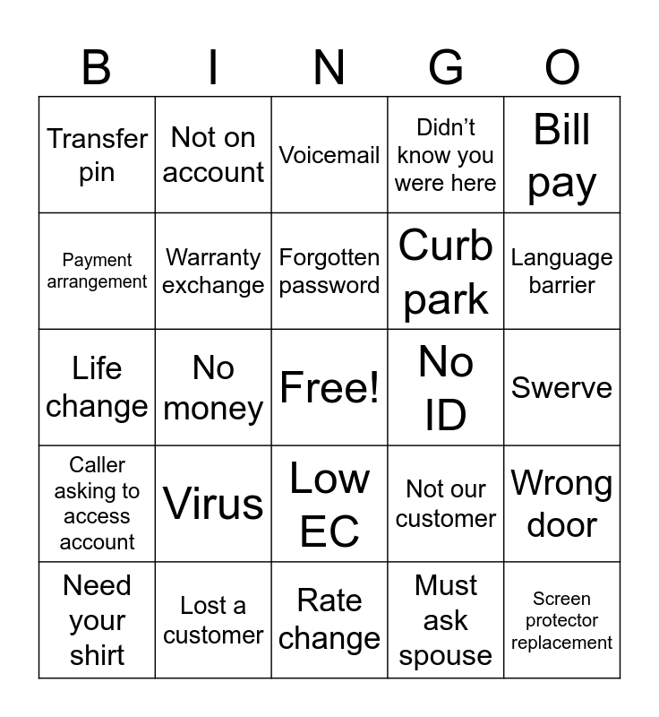 This bingo card has a free space and 25 words: Virus, Rate change, Forgotten password, Need your shirt, Bill pay, Transfer pin, Payment arrangement, Not on account, No ID, Low EC, Curb park, Life change, Not our customer, Wrong door, Warranty exchange, HSI, Swerve, Voicemail, Language barrier, No money, Screen protector replacement, Lost a customer, Caller asking to access account, Didn’t know you were here and Must ask spouse.