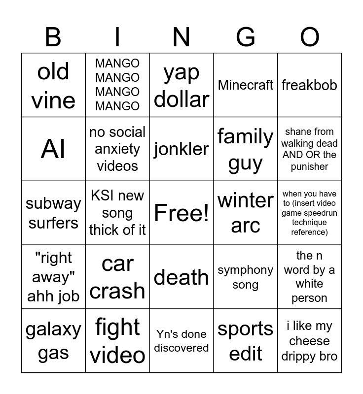 This bingo card has a free space and 24 words: car crash, fight video, jonkler, galaxy gas, freakbob, old vine, AI, MANGO MANGO MANGO MANGO, winter arc, death, family guy, subway surfers, symphony song, the n word by a white person, no social anxiety videos, sports edit, when you have to (insert video game speedrun technique reference), yap dollar, shane from walking dead AND OR the punisher, KSI new song thick of it, i like my cheese drippy bro, "right away" ahh job, Minecraft and Yn's done discovered.