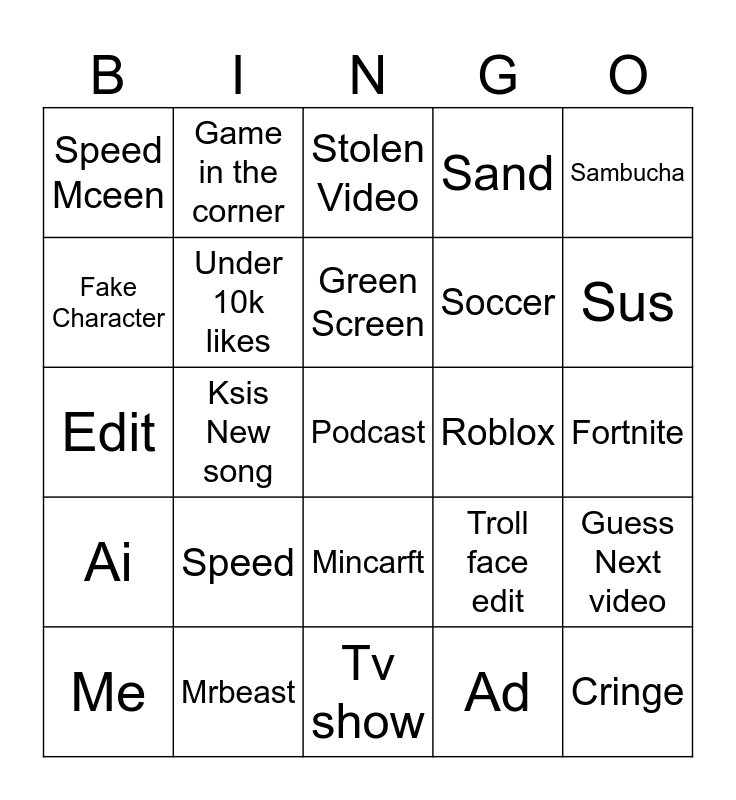 This bingo card has a free space and 24 words: Speed, Mrbeast, Green Screen, Me, Sambucha, Speed Mceen, Fake Character, Game in the corner, Roblox, Mincarft, Soccer, Edit, Troll face edit, Guess Next video, Under 10k likes, Ad, Fortnite, Stolen Video, Sus, Ksis New song, Cringe, Ai, Sand and Tv show.