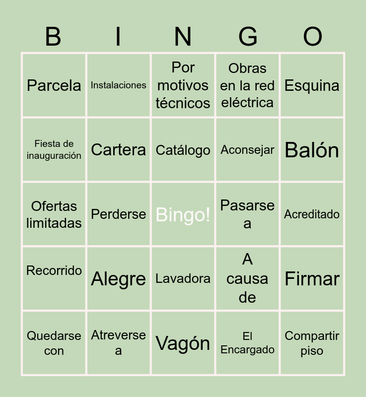 This bingo card has a free space and 24 words: Alegre, Atreverse a, Catálogo, Quedarse con, Esquina, Parcela, Fiesta de inauguración, Instalaciones, Pasarse a, Lavadora, Aconsejar, Ofertas limitadas, A causa de, Firmar, Cartera, El Encargado, Acreditado, Por motivos técnicos, Balón, Perderse, Compartir piso, Recorrido, Obras en la red eléctrica and Vagón.
