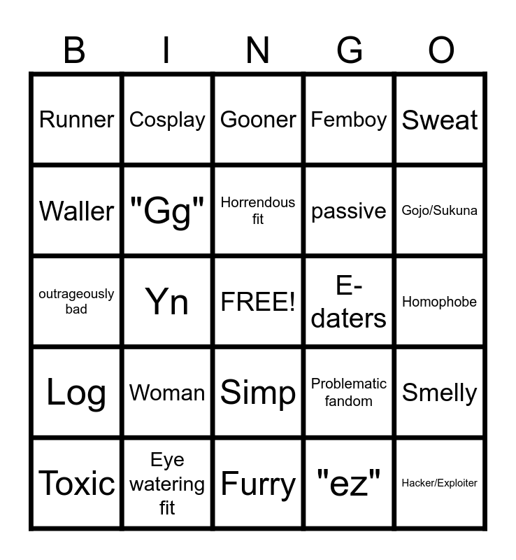 This bingo card has a free space and 24 words: Woman, Eye watering fit, Horrendous fit, Toxic, Sweat, Runner, Waller, Cosplay, E-daters, Simp, passive, outrageously bad, Problematic fandom, Smelly, "Gg", "ez", Homophobe, Gooner, Gojo/Sukuna, Yn, Hacker/Exploiter, Log, Femboy and Furry.