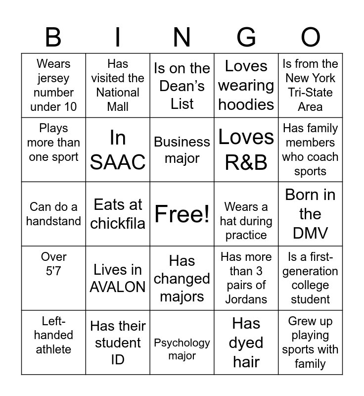 This bingo card has a free space and 24 words: Left-handed athlete, Lives in AVALON, Business major, Has dyed hair, Is from the New York Tri-State Area, Wears jersey number under 10, Has visited the National Mall, Is on the Dean’s List, Wears a hat during practice, Born in the DMV, Can do a handstand, In SAAC, Has more than 3 pairs of Jordans, Is a first-generation college student, Plays more than one sport, Has their student ID, Psychology major, Loves wearing hoodies, Has family members who coach sports, Over 5'7, Eats at chickfila, Has changed majors, Loves R&B and Grew up playing sports with family.