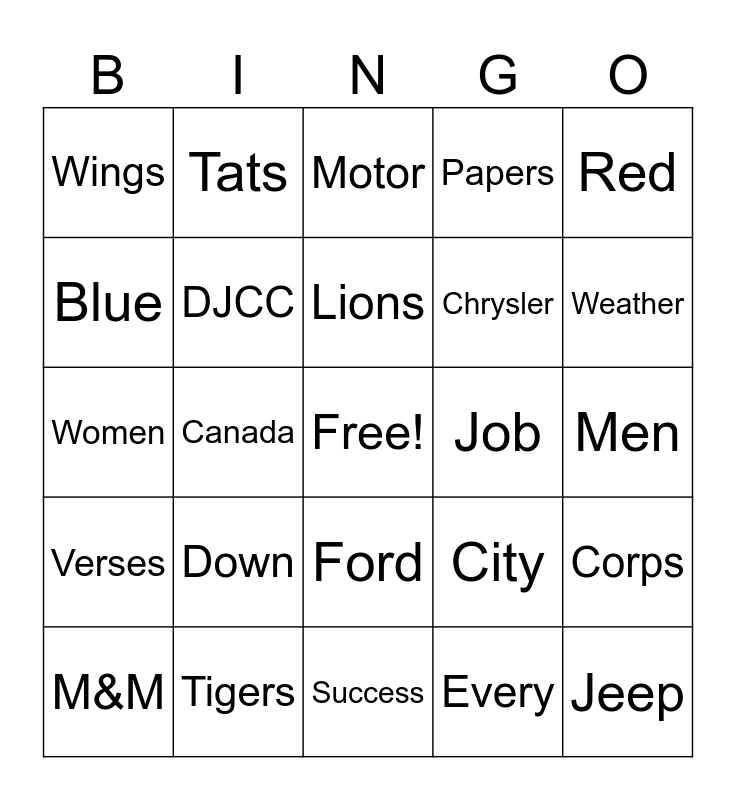 This bingo card has a free space and 31 words: Detroit, Tigers, Lions, Pistons, Red, Wings, DJCC, Ford, Chrysler, Jeep, M&M, Canada, Every, Body, Verses, Career, 313, Job, Corps, Success, Blue, Down, Town, Papers, Men, Women, Tats, Motor, City, Weather and Sports.