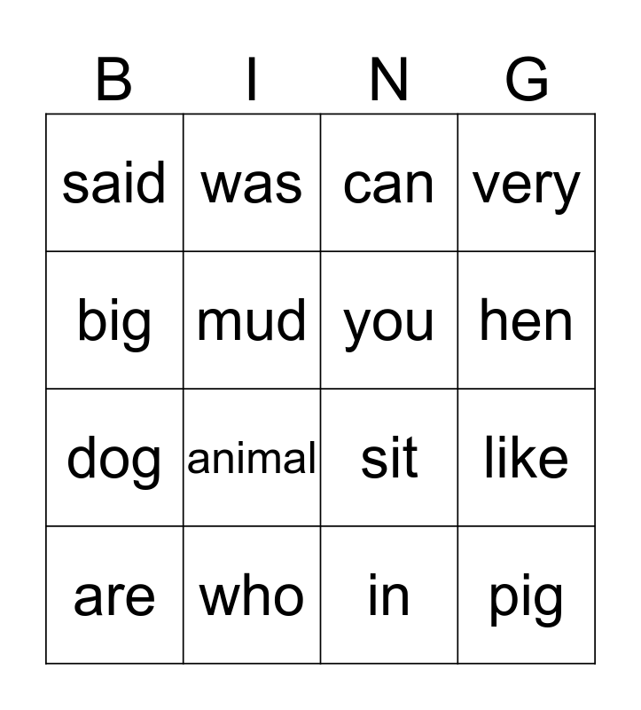 This bingo card has 16 words: who, like, can, said, dog, was, sit, in, big, mud, are, very, animal, hen, you and pig.