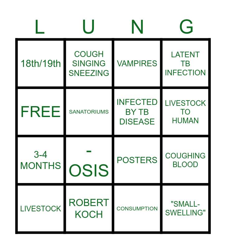 This bingo card has 16 words: ROBERT KOCH, COUGHING BLOOD, VAMPIRES, 18th/19th, 3-4 MONTHS, COUGH SINGING SNEEZING, POSTERS, CONSUMPTION, FREE, SANATORIUMS, LIVESTOCK, LATENT TB INFECTION, -OSIS, LIVESTOCK TO HUMAN, INFECTED BY TB DISEASE and "SMALL-SWELLING".