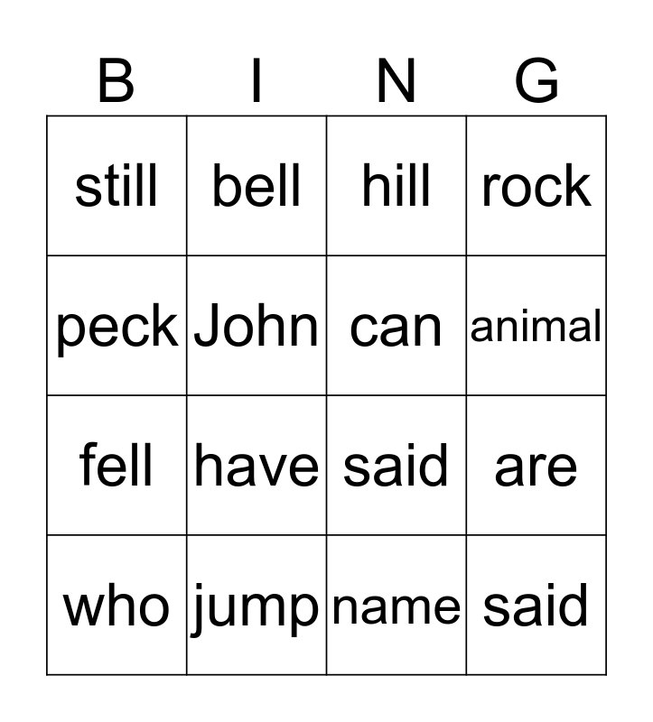 This bingo card has 16 words: jump, are, hill, still, fell, bell, said, name, peck, John, who, rock, have, animal, can and said.
