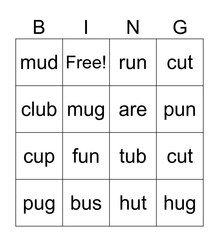 This bingo card has 19 words: tub, nut, run, hug, cut, club, hut, mud, Free!, cup, fun, mug, are, bus, pug, sun, cut, pun and gum.