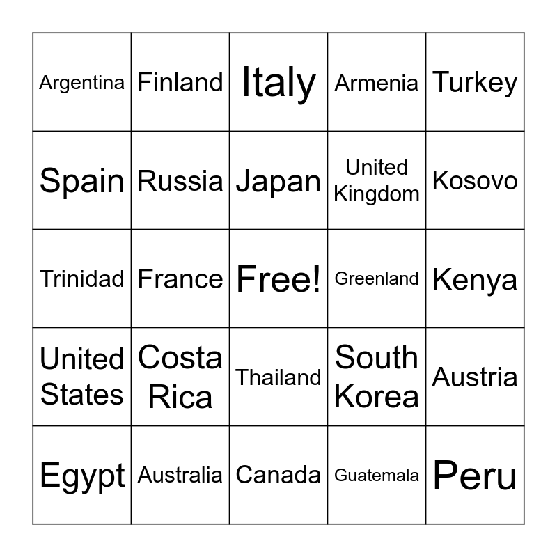 This bingo card has a free space and 29 words: Egypt, Morocco, France, Nigeria, Argentina, Italy, Russia, Costa Rica, Greenland, Australia, Kenya, Peru, Canada, Guatemala, Kosovo, Greece, Thailand, United States, Turkey, Trinidad, South Korea, Bulgaria, United Kingdom, Spain, Armenia, Finland, Austria, Japan and Malaysia.