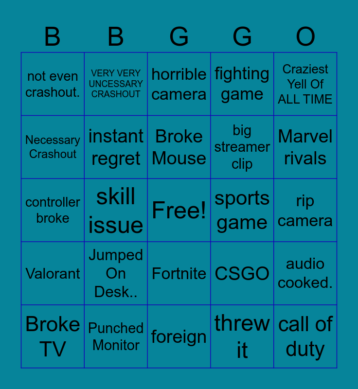 This bingo card has a free space and 24 words: Jumped On Desk.., Punched Monitor, Broke Mouse, Broke TV, Craziest Yell Of ALL TIME, not even crashout., Necessary Crashout, VERY VERY UNCESSARY CRASHOUT, sports game, Fortnite, big streamer clip, controller broke, CSGO, audio cooked., instant regret, threw it, rip camera, horrible camera, Marvel rivals, skill issue, call of duty, Valorant, fighting game and foreign.