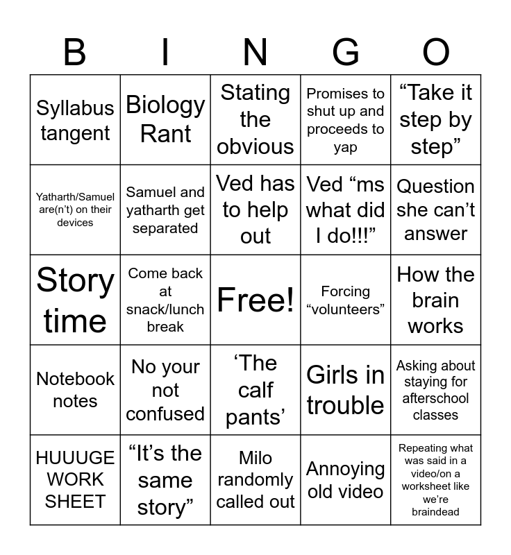 This bingo card has a free space and 26 words: ‘The calf pants’, Annoying old video, Ved has to help out, “It’s the same story”, “Take it step by step”, Syllabus tangent, Yatharth/Samuel are(n’t) on their devices, Biology Rant, How the brain works, Girls in trouble, Ved “ms what did I do!!!”, Story time, Asking about staying for afterschool classes, HUUUGE WORK SHEET, Come back at snack/lunch break, Do we meet on Wednesday/friday?, Promises to shut up and proceeds to yap, Notebook notes, Stating the obvious, Repeating what was said in a video/on a worksheet like we’re braindead, Question she can’t answer, Milo randomly called out, Forcing “volunteers”, No your not confused, Samuel and yatharth get separated and Keeps us for “1 more minute” after class.