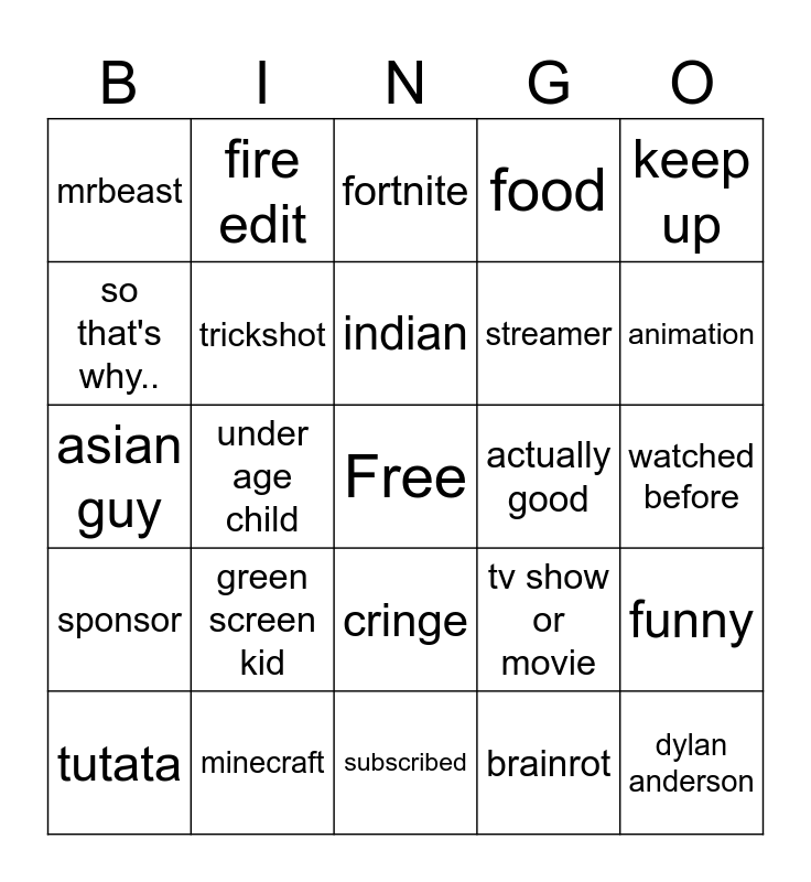 This bingo card has a free space and 24 words: green screen kid, minecraft, indian, tutata, keep up, mrbeast, so that's why.., fire edit, actually good, cringe, streamer, asian guy, tv show or movie, funny, trickshot, brainrot, watched before, fortnite, animation, under age child, dylan anderson, sponsor, food and subscribed.