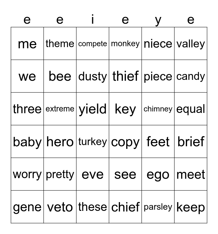 This bingo card has 36 words: see, eve, chief, we, baby, key, bee, these, niece, ego, candy, monkey, meet, extreme, thief, me, worry, chimney, three, compete, yield, hero, copy, turkey, feet, theme, piece, veto, dusty, valley, keep, gene, brief, equal, pretty and parsley.