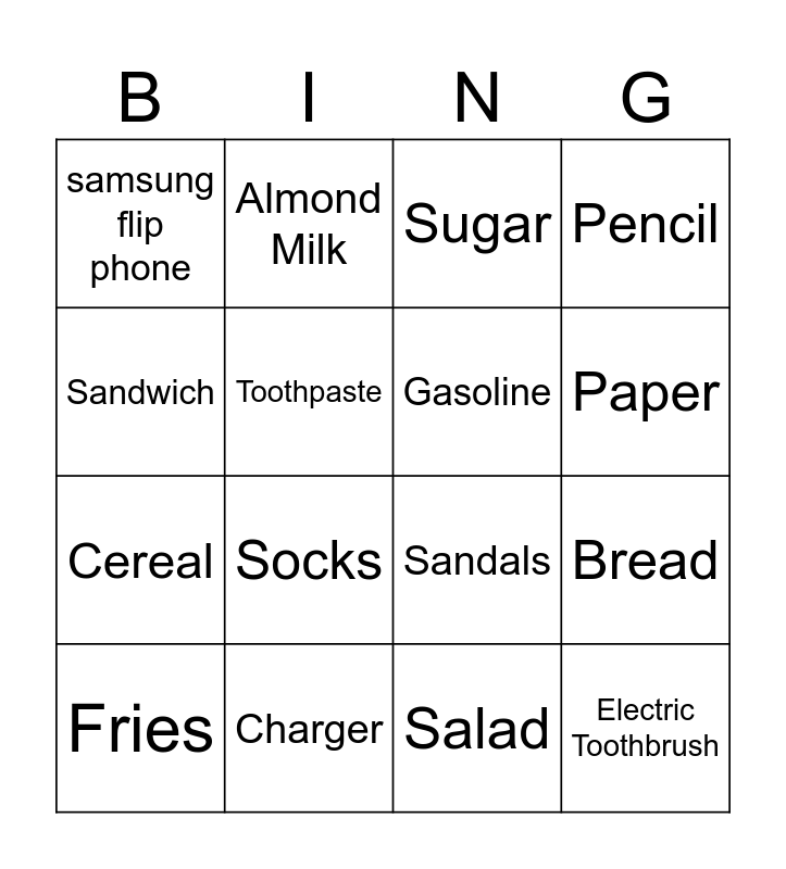 This bingo card has 20 words: Bread, cheese, Sugar, Tea, Fries, Sandwich, Charger, samsung flip phone, Cereal, Almond Milk, Socks, Sandals, Toothpaste, Electric Toothbrush, Gasoline, Bicycle, Paper, Pencil, Salad and Sandwich.