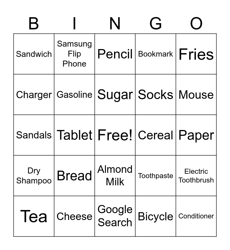 This bingo card has a free space and 24 words: Bread, Cheese, Sugar, Tea, Fries, Sandwich, Charger, Samsung Flip Phone, Cereal, Almond Milk, Socks, Sandals, Toothpaste, Electric Toothbrush, Gasoline, Bicycle, Paper, Pencil, Mouse, Tablet, Conditioner, Dry Shampoo, Bookmark and Google Search.