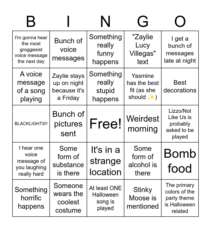 This bingo card has a free space and 24 words: Some form of substance is there, Someone wears the coolest costume, Something really stupid happens, Something horrific happens, I get a bunch of messages late at night, I'm gonna hear the most groggesist voice message the next day, A voice message of a song playing, Bunch of voice messages, Weirdest morning, It's in a strange location, Yasmine has the best fit (as she should ✨️), BLACKLIGHTS!!, Some form of alcohol is there, Bomb food, Zaylie stays up on night because it's a Friday, Stinky Moose is mentioned, Lizzo/Not Like Us is probably asked to be played, Something really funny happens, Best decorations, Bunch of pictures sent, The primary colors of the party theme is Halloween related, I hear one voice message of you laughing really hard, "Zaylie Lucy Villegas" text and At least ONE Halloween song is played.