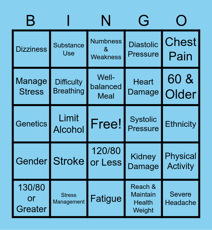 This bingo card has a free space and 24 words: Stroke, Stress Management, Well-balanced Meal, 130/80 or Greater, Chest Pain, Dizziness, Manage Stress, Substance Use, Systolic Pressure, 120/80 or Less, Heart Damage, Genetics, Kidney Damage, Physical Activity, Difficulty Breathing, Reach & Maintain Health Weight, Ethnicity, Numbness & Weakness, 60 & Older, Limit Alcohol, Severe Headache, Gender, Diastolic Pressure and Fatigue.
