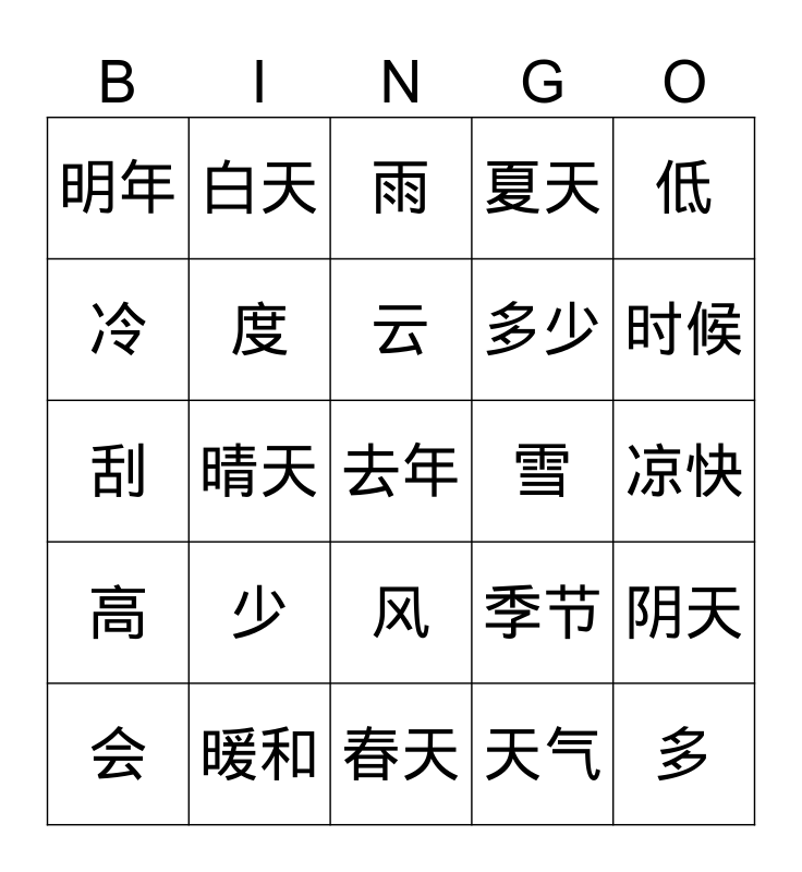 Bingo | 天气 | 天气和气温 | Weather | 天气(一)
