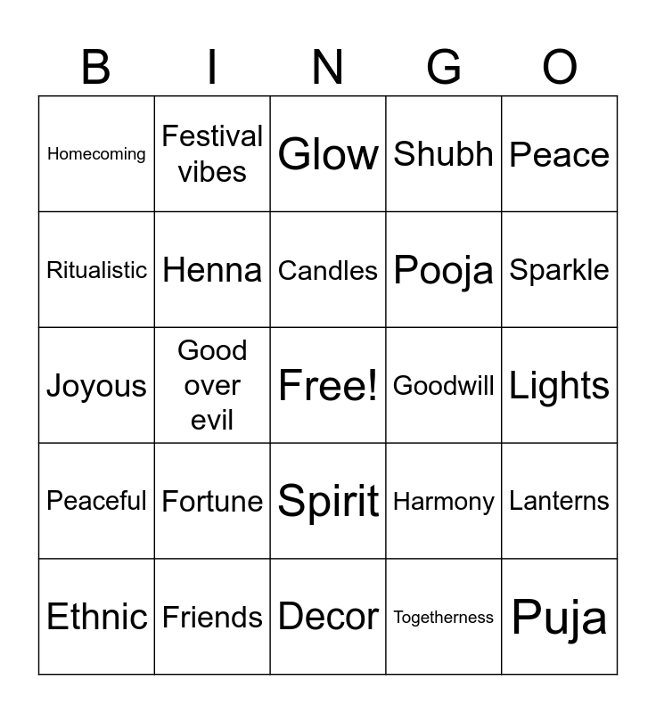 This bingo card has a free space and 100 words: Diwali, Festival, Lights, Diyas, Rangoli, Fireworks, Crackers, Celebration, Festivity, Happiness, Prosperity, Joy, Family, Friends, Sweets, Mithai, Pooja, Rituals, Worship, Lakshmi, Ganesh, Blessings, Wealth, Health, Abundance, Goodwill, Peace, Harmony, Triumph, Victory, Good over evil, Homecoming, Tradition, Love, Togetherness, Candles, Lanterns, Festoon, Gifts, Sharing, Compassion, Kindness, Joyous, Glitter, Sparkle, Glow, Illumination, Festival of lights, Auspicious, Decor, Celebration, Unity, Spirit, Festooning, Heritage, Reverence, New beginnings, Cleanliness, Prosperous, Shubh, Gratefulness, Prayers, Offerings, Blessing, Rituals, Spirit, Patakha, Tradition, Renewal, Inner light, Gratitude, Fortune, Puja thali, Incense, Agarbatti, Fasting, Hope, Ritualistic, Festive, Devotion, Spiritual, Puja, Renewal, Spirit, Abundance, Festival vibes, Heritage, Divinity, Fire, Peaceful, Oil lamps, Gifting, Bhajans, Ethnic, Henna, Attire, Celebratory, Rejoicing, Puja room and Feast.