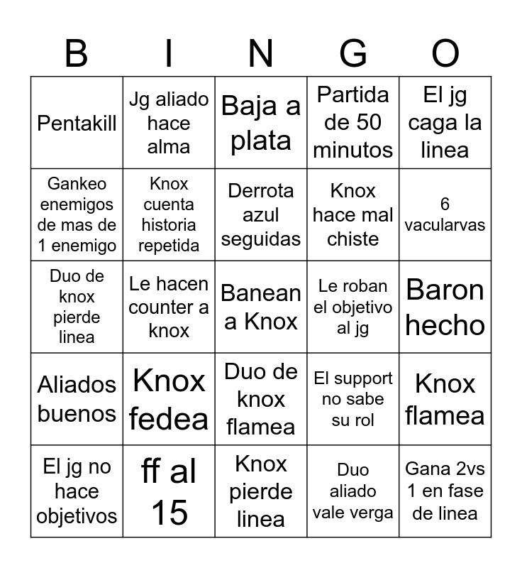 This bingo card has 25 words: Knox fedea, Knox pierde linea, Derrota azul seguidas, El jg no hace objetivos, El jg caga la linea, Pentakill, Gankeo enemigos de mas de 1 enemigo, Jg aliado hace alma, Le roban el objetivo al jg, Duo de knox flamea, Knox hace mal chiste, Duo de knox pierde linea, El support no sabe su rol, Knox flamea, Knox cuenta historia repetida, Gana 2vs 1 en fase de linea, Baron hecho, Baja a plata, 6 vacularvas, Le hacen counter a knox, Banean a Knox, ff al 15, Aliados buenos, Partida de 50 minutos and Duo aliado vale verga.