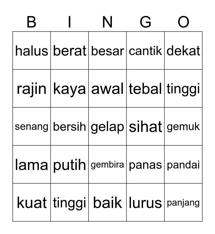 This bingo card has a free space and 24 words: putih, tinggi, awal, kuat, dekat, halus, rajin, berat, sihat, gembira, tebal, senang, panas, pandai, kaya, lurus, gemuk, besar, tinggi, bersih, panjang, lama, cantik and baik.