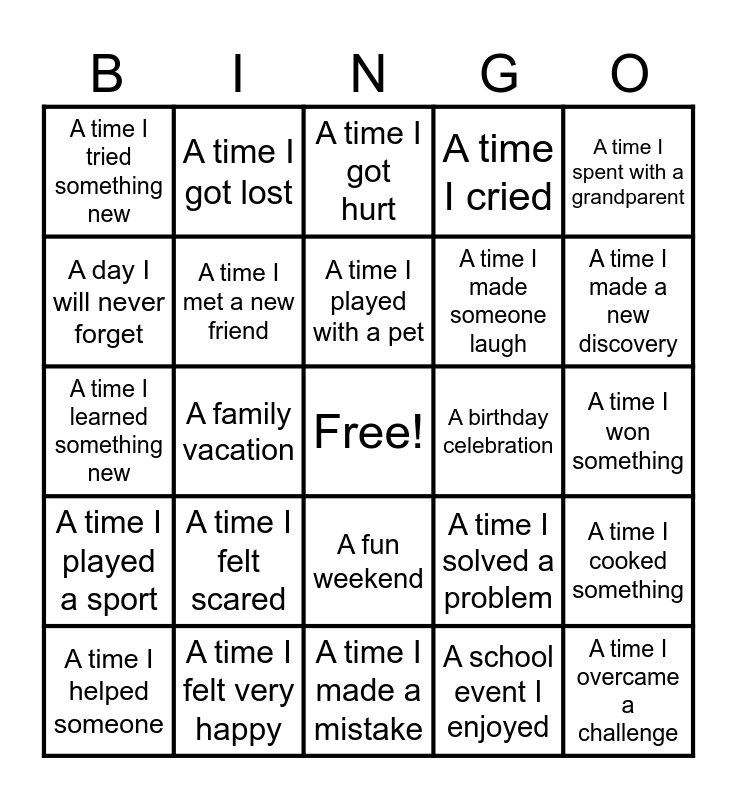 This bingo card has a free space and 29 words: A time I helped someone, A time I was proud of myself, A family vacation, A time I lost something important, A time I tried something new, A time I got hurt, A time I met a new friend, A time I felt scared, A birthday celebration, A time I felt very happy, A time I won something, A time I overcame a challenge, A time I made a mistake, A school event I enjoyed, A time I made a new discovery, A time I felt embarrassed, A fun weekend, A time I played a sport, A time I spent with a grandparent, A time I learned something new, A time I solved a problem, A holiday I celebrated, A time I made someone laugh, A day I will never forget, A time I cried, A time I got lost, A time I cooked something, A time I played with a pet and A time I had a sleepover.