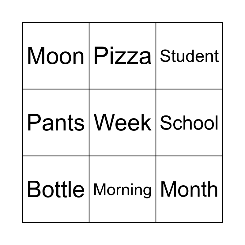 This bingo card has a free space and 8 words: School, Student, Pizza, Bottle, Moon, Month, Pants and Morning.