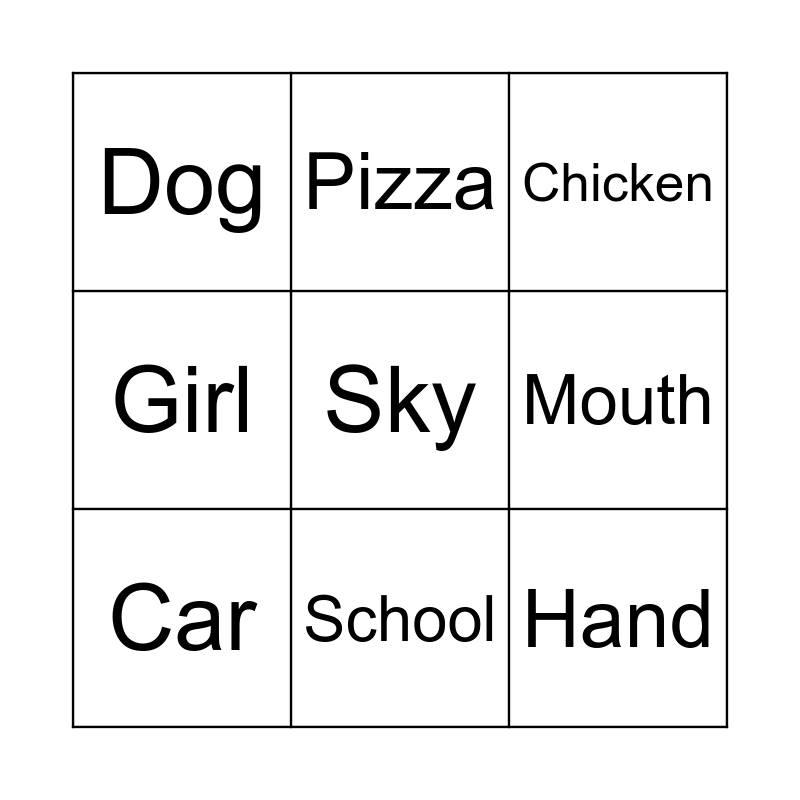 This bingo card has a free space and 8 words: Mouth, Chicken, Pizza, Car, Dog, Hand, Girl and School.