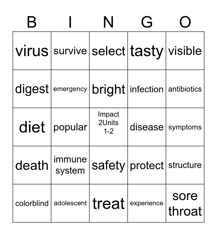 This bingo card has a free space and 39 words: good luck, wedding, danger, emergency, colorblind, safety, bright, represent, visible, death, popular, tasty, sore throat, symptoms, disease, immune system, bacteria, virus, cell, protect, digest, treat, infection, antibiotics, invade, vaccinations, emotion, illness, positive, survive, nervous, stress, select, adolescent, experience, process, structure, diet and surroundings.