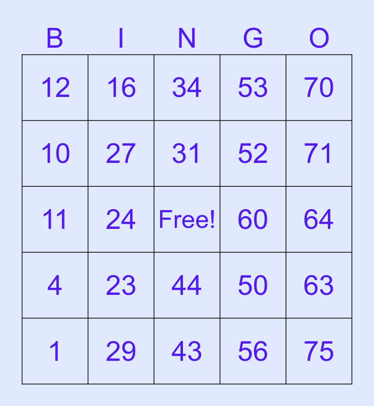 This bingo card has a free space and 24 words: 1, 23, 31, 56, 70, 12, 16, 34, 60, 64, 11, 27, 50, 63, 10, 29, 43, 53, 71, 4, 24, 44, 52 and 75.