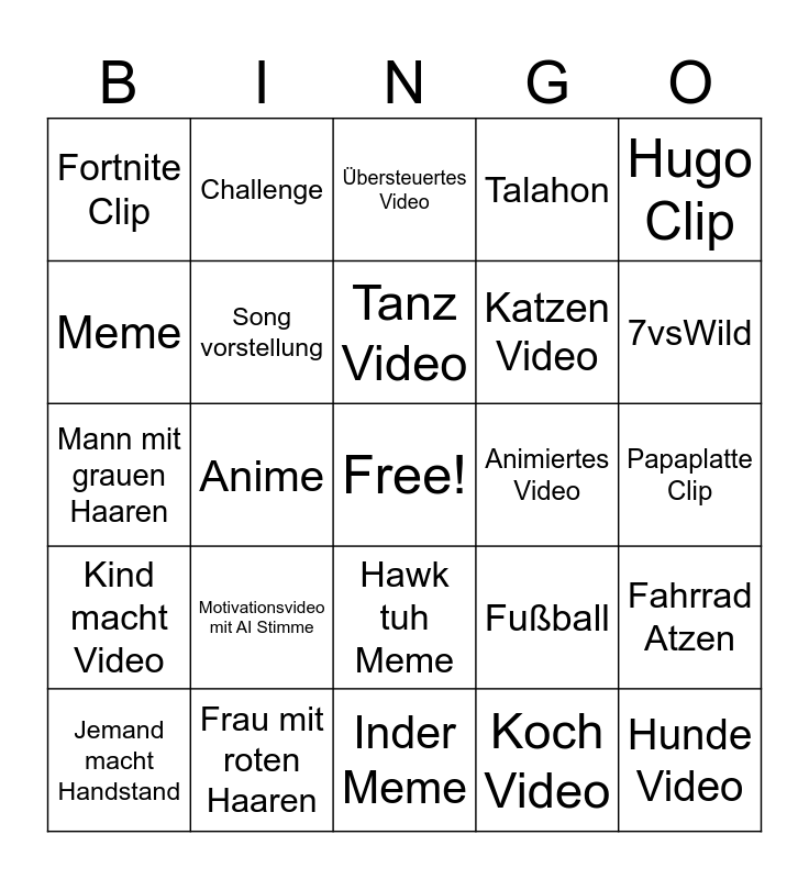 This bingo card has a free space and 24 words: Motivationsvideo mit AI Stimme, Frau mit roten Haaren, Tanz Video, Jemand macht Handstand, Hugo Clip, Fortnite Clip, Meme, Challenge, Animiertes Video, Hawk tuh Meme, Katzen Video, Mann mit grauen Haaren, Fußball, Fahrrad Atzen, Song vorstellung, Koch Video, Papaplatte Clip, Übersteuertes Video, 7vsWild, Anime, Hunde Video, Kind macht Video, Talahon and Inder Meme.