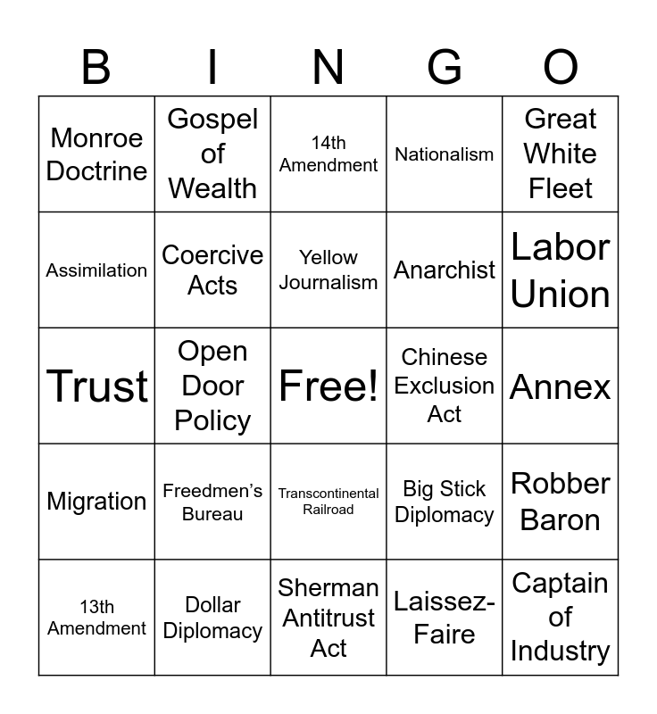 This bingo card has a free space and 35 words: Stamp Act, Gilded Age, Imperialism, Coercive Acts, Transcontinental Railroad, Nationalism, Assimilation, Monopoly, Yellow Journalism, Dawes Act, Trust, Great White Fleet, Trail of Tears, Social Darwinism, Monroe Doctrine, Chinese Exclusion Act, Laissez-Faire, Open Door Policy, Migration, Captain of Industry, Big Stick Diplomacy, 13th Amendment, Robber Baron, Dollar Diplomacy, 14th Amendment, Labor Union, Platt Amendment, 15th Amendment, Anarchist, Annex, Confederate States, Sherman Antitrust Act, Freedmen’s Bureau, Gospel of Wealth and Immigration.