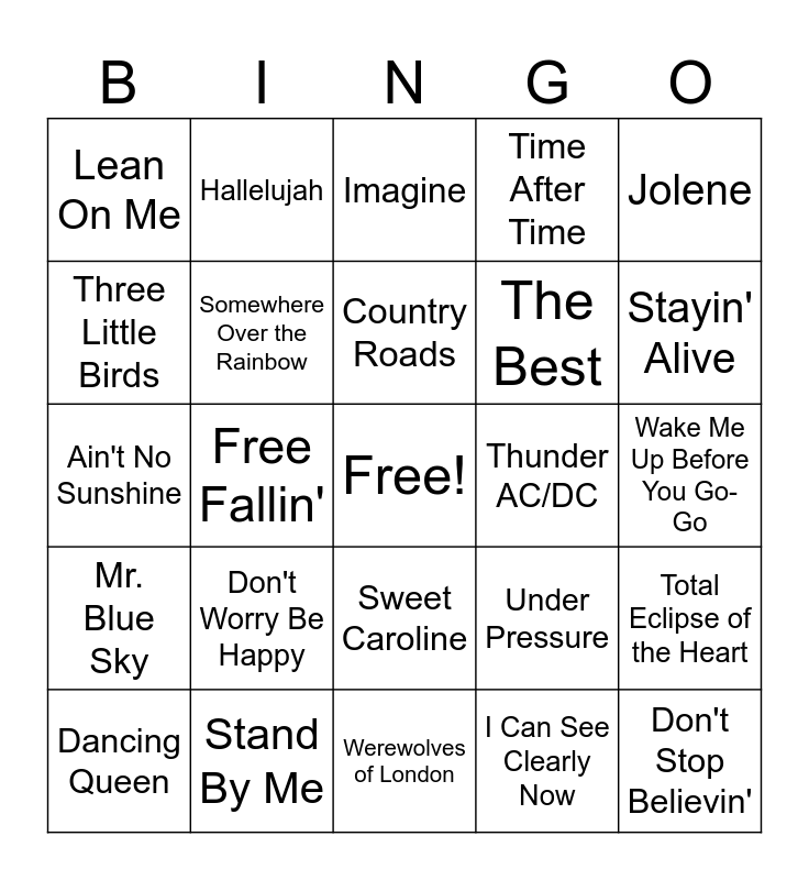 This bingo card has a free space and 24 words: Don't Worry Be Happy, Stand By Me, Country Roads, Dancing Queen, Jolene, Lean On Me, Three Little Birds, Hallelujah, Thunder AC/DC, Sweet Caroline, The Best, Ain't No Sunshine, Under Pressure, Total Eclipse of the Heart, Somewhere Over the Rainbow, I Can See Clearly Now, Wake Me Up Before You Go-Go, Imagine, Stayin' Alive, Free Fallin', Don't Stop Believin', Mr. Blue Sky, Time After Time and Werewolves of London.