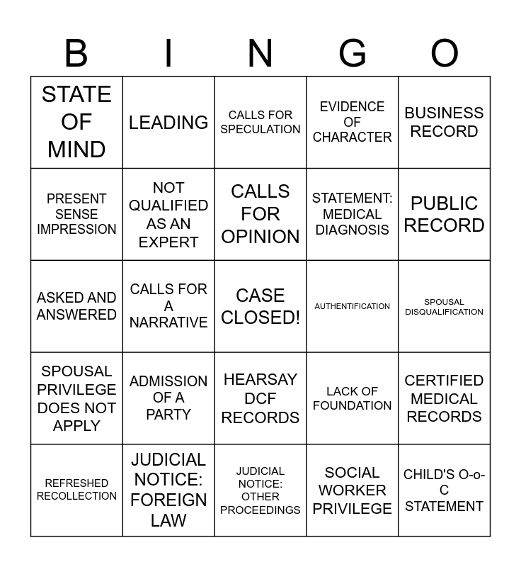 This bingo card has a free space and 33 words: JUDICIAL NOTICE: FACT, ASSUMES FACT NOT IN EVIDENCE, CALLS FOR A NARRATIVE, EXCEPTION TO SPOUSAL DISQUALIFICATION, SPOUSAL PRIVILEGE DOES NOT APPLY, NOT QUALIFIED AS AN EXPERT, BUSINESS RECORD, REFRESHED RECOLLECTION, LEADING, BEST EVIDENCE RULE, CALLS FOR OPINION, CALLS FOR SPECULATION, MOTION TO STRIKE, DOCTRINE OF COMPLETENESS, AUTHENTIFICATION, PUBLIC RECORD, JUDICIAL NOTICE: FOREIGN LAW, ASKED AND ANSWERED, ADMISSION OF A PARTY, LACK OF FOUNDATION, HEARSAY DCF RECORDS, EXCITED UTTERANCE, STATE OF MIND, SPOUSAL DISQUALIFICATION, JUDICIAL NOTICE: OTHER PROCEEDINGS, CHILD'S O-o-C STATEMENT, EVIDENCE OF CHARACTER, STATEMENT: MEDICAL DIAGNOSIS, PRESENT SENSE IMPRESSION, CERTIFIED MEDICAL RECORDS, ADMISSIBILITY OF FOREIGN DOCUMENT, SOCIAL WORKER PRIVILEGE and PSYCHO-THERAPIST PRIVILEGE.