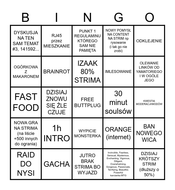 This bingo card has a free space and 24 words: 1h INTRO, GACHA, IZAAK 80% STRIMA, RAID DO NYSI, ODKLEJENIE, DYSKUSJA NA TEN SAM TEMAT #3, 141592..., OGÓRKOWA Z MAKARONEM, RJ45 przez MIESZKANIE, 30 minut soulsów, WYPICIE MONSTERKA, IMLESOWANIE, FAST FOOD, ORANGE (internet), BAN NOWEGO WICA, BRAINROT, Invincible, Fearless, Sensual, Mysterious, Enchanting, Vigorous, Diligent, Overwhelming, Gorgeous, Passionate, Terrifying, Beautiful, Powerful karcianka MTG, KWESTIA MODERACJI/MODÓW, PUNKT 1 REGULAMINU KTÓREGO SAM NIE PAMIĘTA, OLEWANIE LINKÓW OD YAMATORIEGO I W OGÓLE JEGO, DZISIAJ ZNOWU SIĘ ŹLE CZUJE, DZISIAJ KRÓTSZY STRIM (dłuższy o 50%), NOWA GRA NA STRIMA (na liście +500 innych do ogrania), NOWY POMYSŁ NA CONTENT NA STRIM np rysowanie (i tak go nie zrobi) and JUTRO BRAK STRIMA BO WYJAZD.