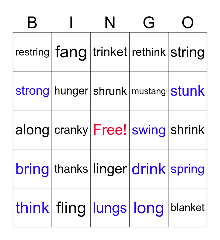 This bingo card has a free space and 24 words: thanks, fling, shrunk, think, string, restring, strong, fang, swing, linger, mustang, along, drink, spring, hunger, long, shrink, trinket, stunk, cranky, blanket, bring, rethink and lungs.