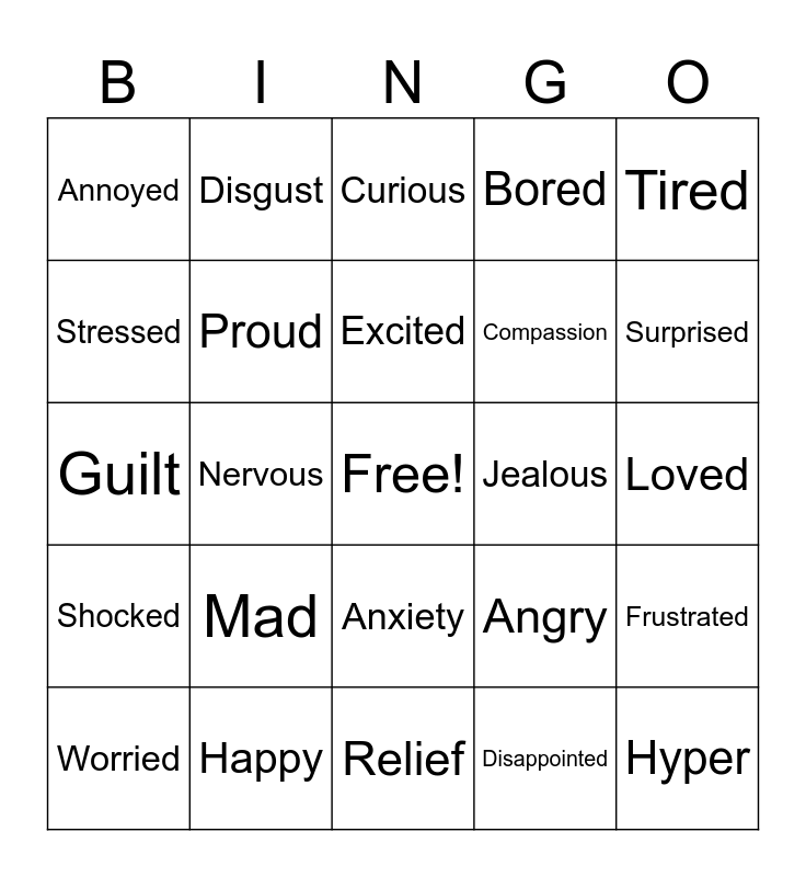 This bingo card has a free space and 24 words: Mad, Happy, Excited, Worried, Tired, Annoyed, Stressed, Disgust, Jealous, Anxiety, Compassion, Guilt, Angry, Frustrated, Proud, Disappointed, Loved, Curious, Surprised, Nervous, Hyper, Shocked, Bored and Relief.