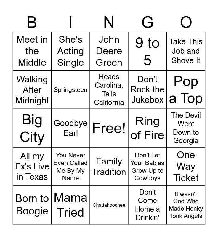 This bingo card has a free space and 52 words: Jolene, It wasn't God Who Made Honky Tonk Angels, Rocket, Chattahoochee, You Never Even Called Me By My Name, Whose Boot have your Bed Been Under, She's Acting Single, Boot Scootin' Boogie, Walking After Midnight, Fishing in The Dark, Springsteen, Rocking with the Rhythm of the Rain, One Way Ticket, Don't Let Your Babies Grow Up to Cowboys, Fool hearted Memory, Sold, Heads Carolina, Tails California, Ring of Fire, Mama's Broken Heart, Take This Job and Shove It, Goodbye Earl, Don't Come Home a Drinkin', Meet in the Middle, Don't Rock the Jukebox, T-R-O-U-B-L-E, Redneck Woman, Swingin', Wine Me Up, Pop a Top, Dang Me, My Maria, 9 to 5, What's Made Milwaukee Famous, Why Not Me, I'm Trying, John Deere Green, Mama Tried, I've Got the Tiger by the Tail, Stand by Your Man, She Thinks My Tractor's Sexy, Highwayman, The Devil Went Down to Georgia, All my Ex's Live in Texas, Rhinestone Cowboy, Family Tradition, Louisiana Woman, Mississippi Man, Hello Darlin', Big City, Set 'em Up Joe, El Paso, Born to Boogie and I Walk the Line.