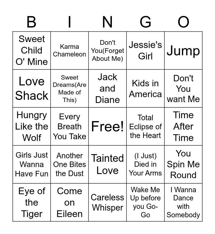 This bingo card has a free space and 29 words: Eye of the Tiger, Livin' on a Prayer, Every Breath You Take, Take on me, Sweet Child O' Mine, Don't You(Forget About Me), Sweet Dreams(Are Made of This), Another One Bites the Dust, Total Eclipse of the Heart, Come on Eileen, Time After Time, I Wanna Dance with Somebody, Careless Whisper, Wake Me Up before you Go-Go, Don't You want Me, Call Me, Tainted Love, Girls Just Wanna Have Fun, Jump, Hungry Like the Wolf, (I Just) Died in Your Arms, When Doves Cry, Kids in America, Love Shack, Jessie's Girl, Karma Chameleon, You Spin Me Round, Jack and Diane and Pour Some Sugar on Me.
